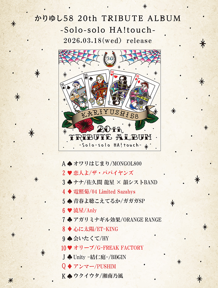 3/18(水)リリース「かりゆし58 20th TRIBUTE ALBUM -Solo-solo HA!touch-」のジャケットデザイン&曲順解禁!